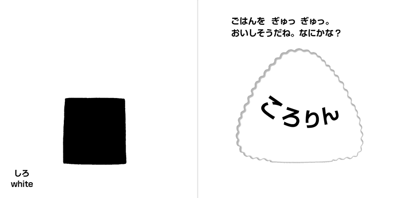 白と黒という色に着目した今回の絵本では、おにぎり、アイスクリーム、おとまじゃくし、牛など、楽しい物や動物がたくさん登場します。